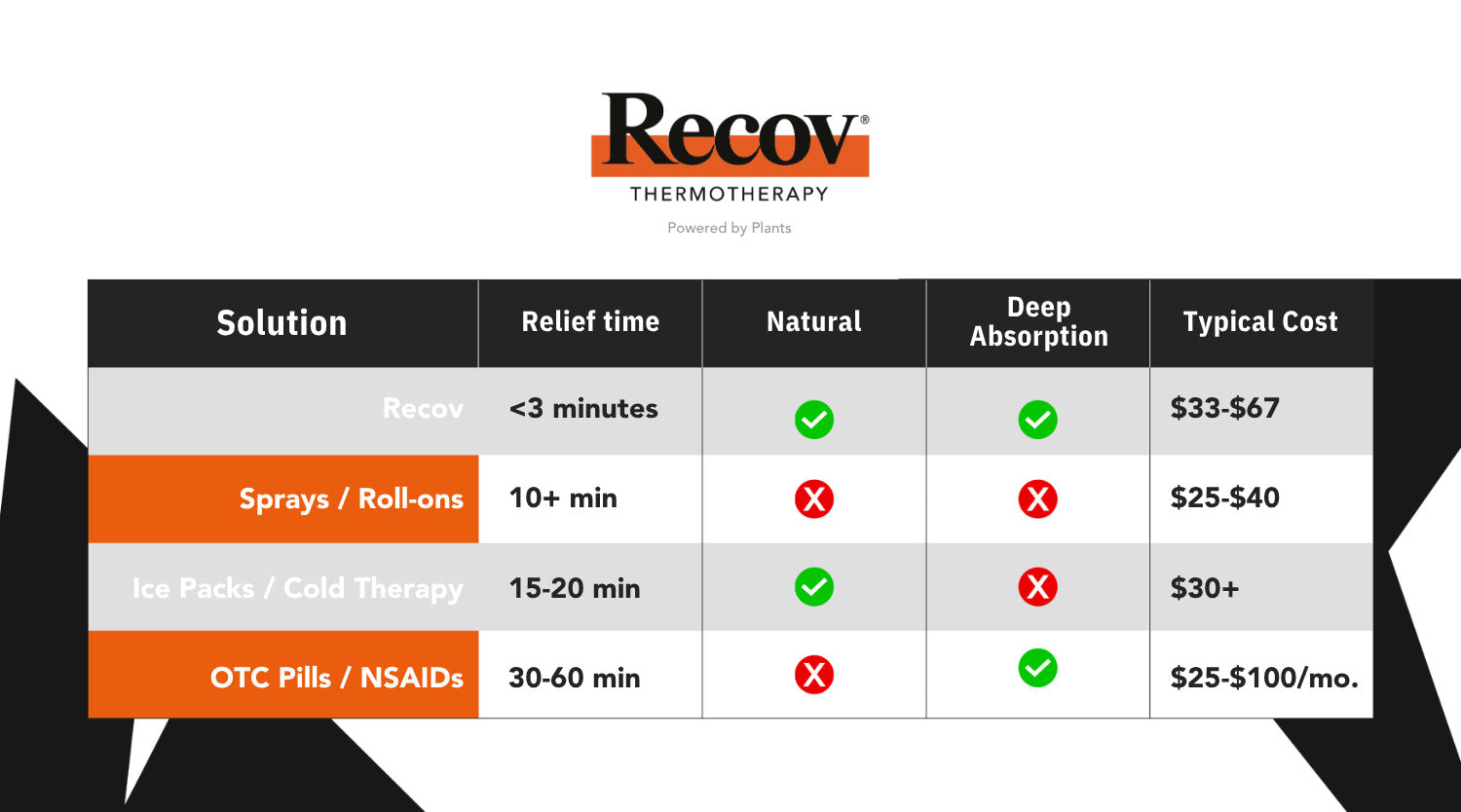 Sprays and roll-ons do not penetrate deeply into inflamed areas. Massaging a topical like Recov helps ingredients reach muscles and joints for maximum relief.